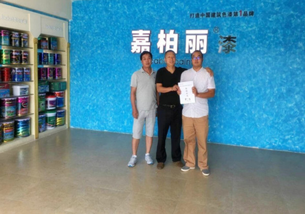 2016年8月11日,嘉柏麗水漆何經(jīng)理經(jīng)過毫無保留的“洪荒之力”以及其專業(yè)優(yōu)秀的服務(wù)能力,與贛州會昌客戶何總簽訂7D色藝漆經(jīng)銷合同,業(yè)績驕人!可喜可賀!