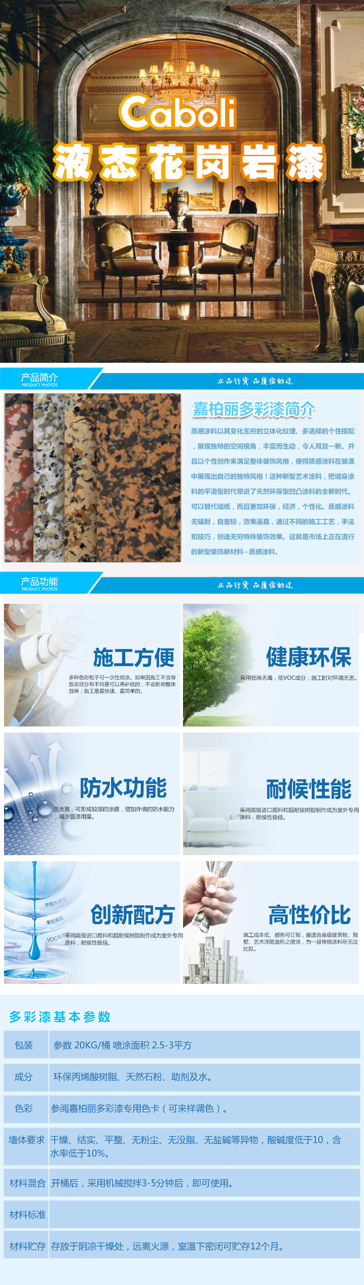 嘉柏麗多彩漆用高性能彈性膩?zhàn)雍投喾N全水性樹脂聚合配以高檔次的顏料和助劑,以高科技工藝加工成各系列裝飾材料.